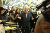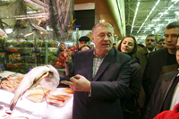 Пообщаться с народом Владимир Жириновский решил в гипермаркете «Лента». В магазины Жириновский ходит почти в каждом городе. По мнению лидера ЛДПР, именно в «Ленте» можно встретить бедных. Однако в гипермаркете больше интересовался прилавками, чем бедностью. Купил два больших пирога – с красной рыбой и ватрушку. Потряс карельской форелью, которая, по словам политика, самая дешевая в России. Но брать не стал. Напоследок попросил завернуть два блинчика.